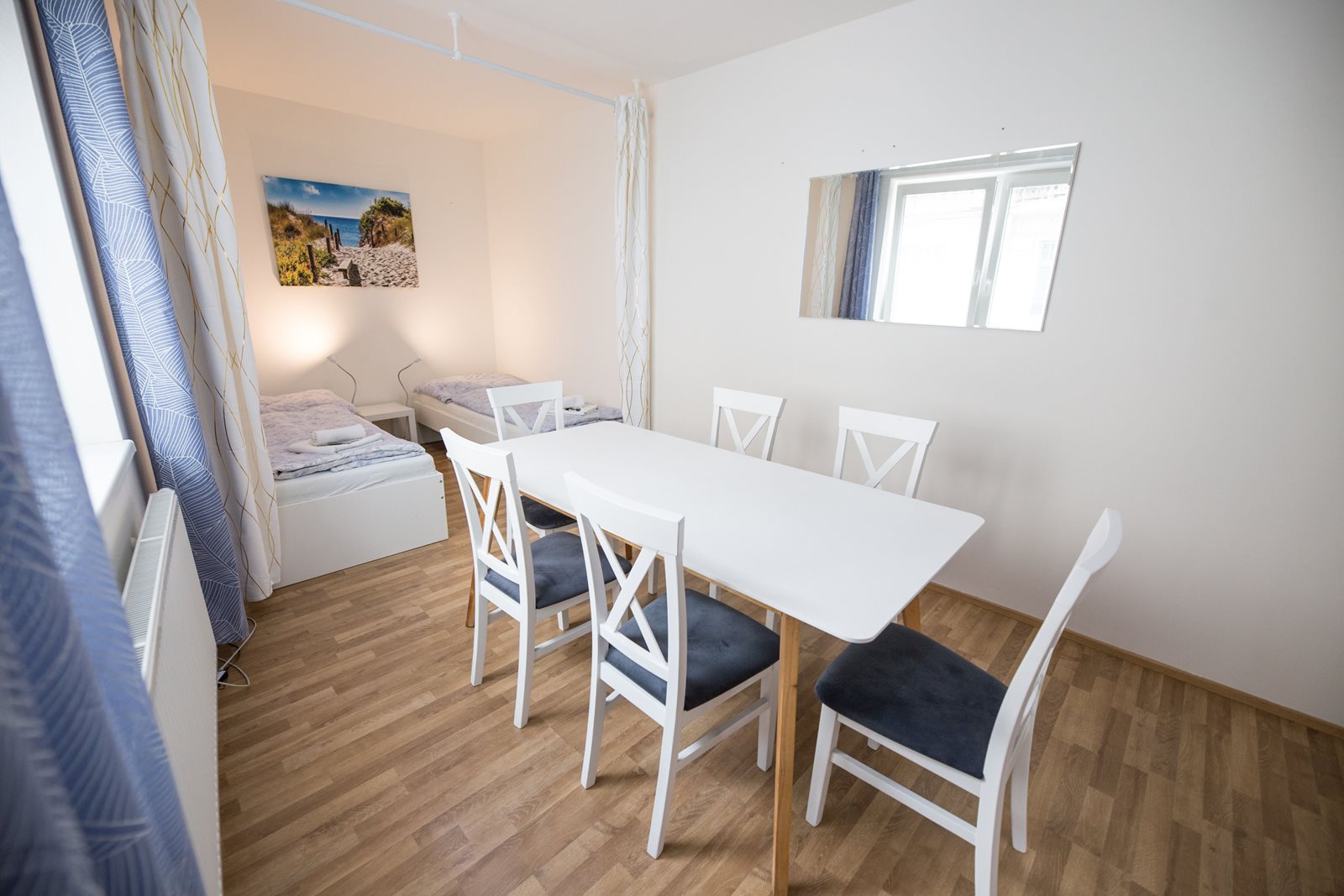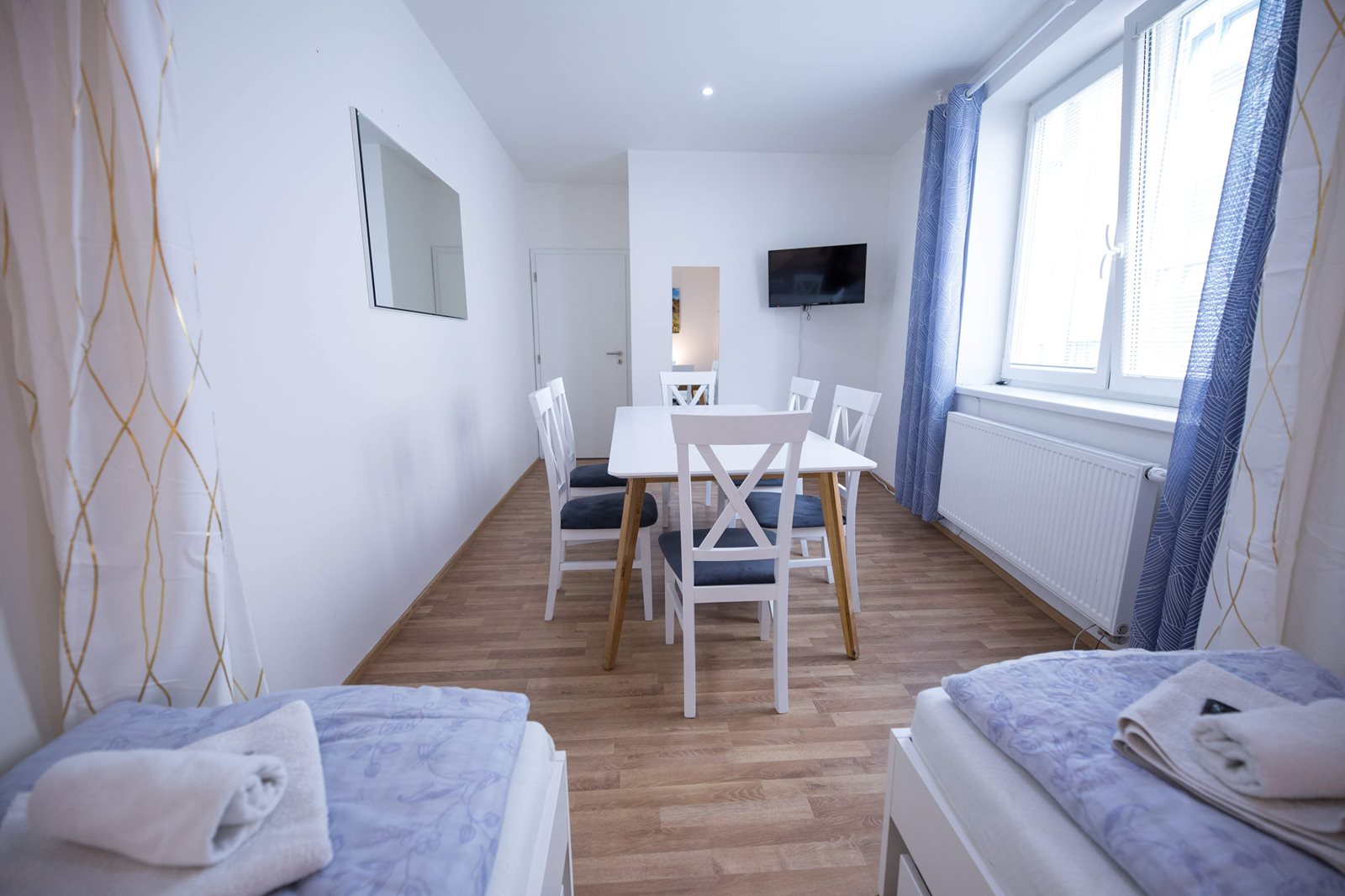 Prostorný byt se skládá z dvou ložnic a obývacího pokoje. Díky své variabilnosti je apartmán vhodný jak pro skupinu přátel, rodinu, tak pro firemní zaměstnance na služební cestě. Samozřejmostí je vybavenost ložním prádlem, ručníky, šampóny a hotelovým mýdlem.