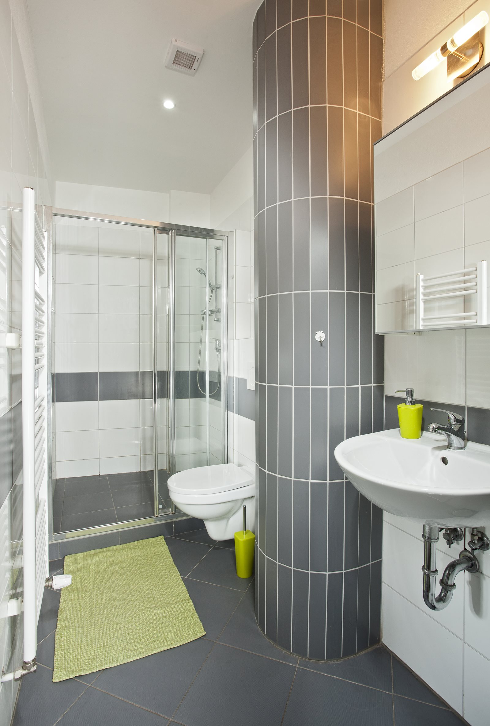V apartmánu je koupelna spojená s toaletou a ještě jedno WC. Koupelna je zařízena sprchovým koutem.