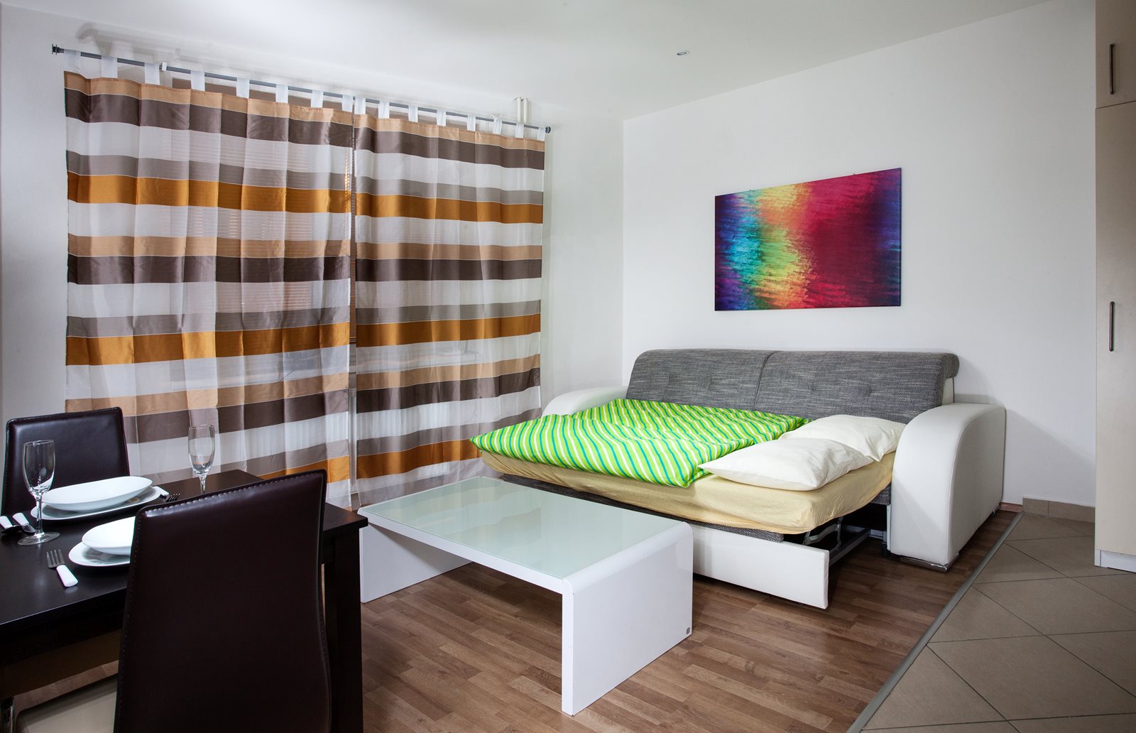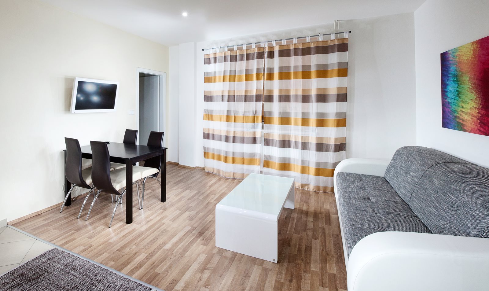 This apartment offers up to four places for sleeping. The bedroom has a double bed with night tables. The living room has a sofa that offers two additional seats (190x140 cm). In the living room is located a table with chairs and TV is available for guests. The living room is connected to a kitchen that is fully equipped with kitchen utensils including a fridge and freezer. The apartment also includes a washing machine. The bathroom is equipped with a shower, and there is a hair dryer. The bathroom is connected to the toilet. The apartment also has an iron, an ironing board and a clothes dryer. An integral part of the equipment is a free wifi connection. Apartments offer parking, right in the building in the underground garage.