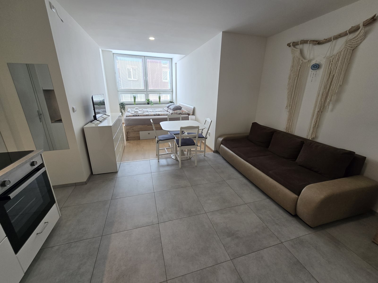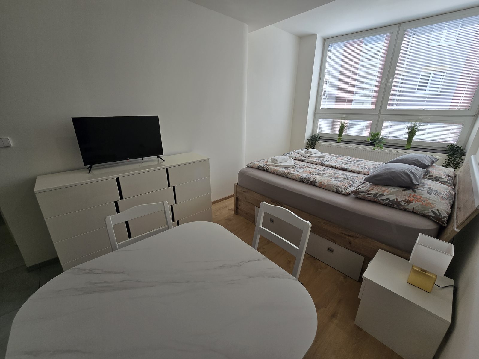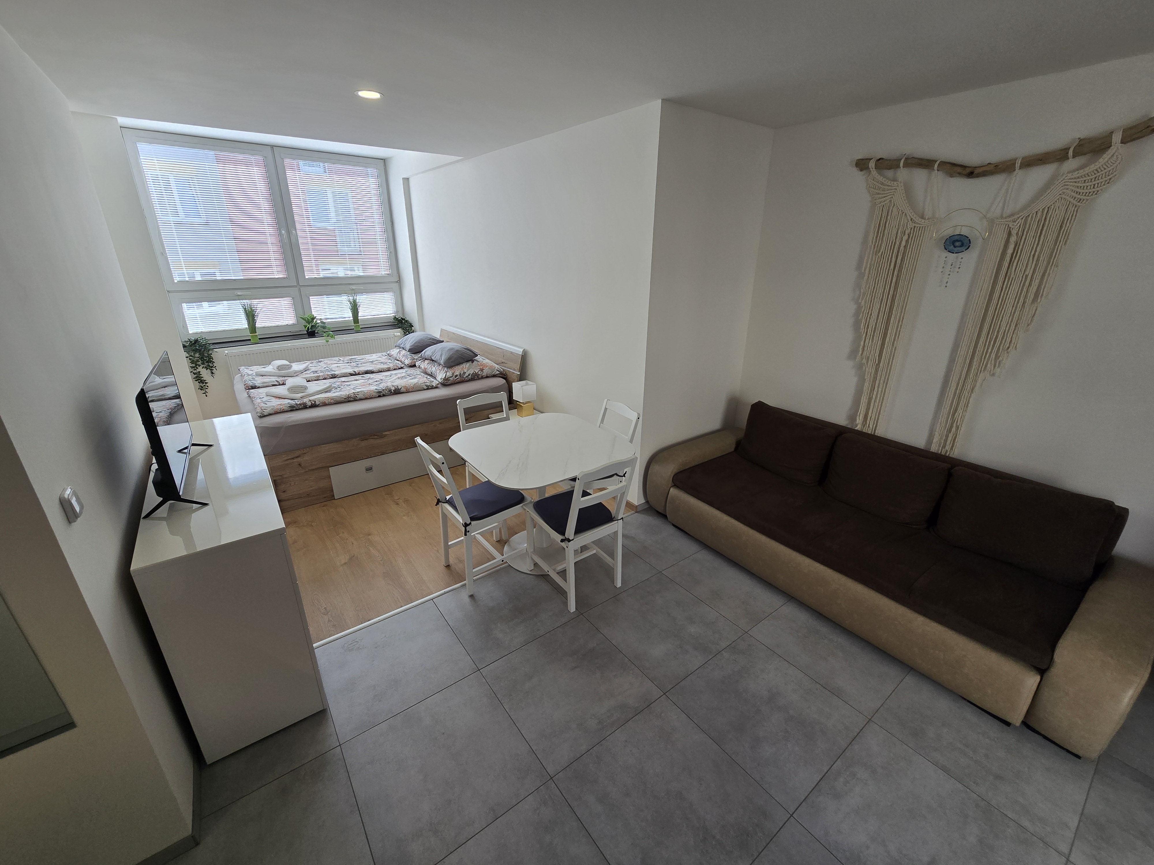 This apartment offers up to 4 sleeping places. There is one room in the apartment, there is a double bed and sofa bed, offers two additional sleeping areas which after the layout. The apartment is also equipped with TV. For guests there is a kitchen table with four chairs and is fully equipped. There is a microwave oven, hob, kettle, combined fridge / freezer. Of course, kitchen utensils are commonplace. The bathroom is separate and has a shower, and a hairdryer is available. Toilet with sink is separate. An integral part of the equipment is a free wifi connection. Apartments offer parking, right in the building in the underground garage.