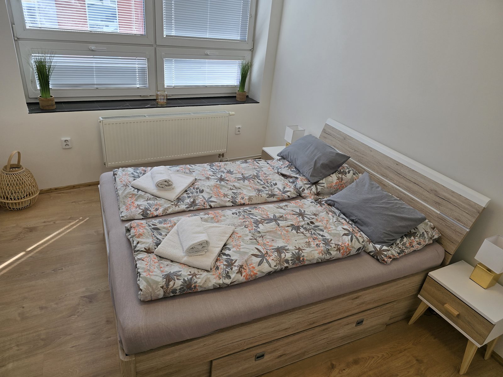 This apartment offers up to 5 sleeping places. There are two separated bedrooms in the apartment, in the first is a double bed and one single bed. The second bedroom offers sofa bed, offers two additional sleeping areas which after the layout. The apartment is also equipped with TV. For guests there is a kitchen table with four chairs. Separate kitchen is fully equipped. There is a microwave oven, hob, kettle, combined fridge / freezer. Of course, kitchen utensils are commonplace. The bathroom is separate and has a shower, and a hairdryer is available. Toilet with sink is separate. An integral part of the equipment is a free wifi connection. Apartments offer parking, right in the building in the underground garage.